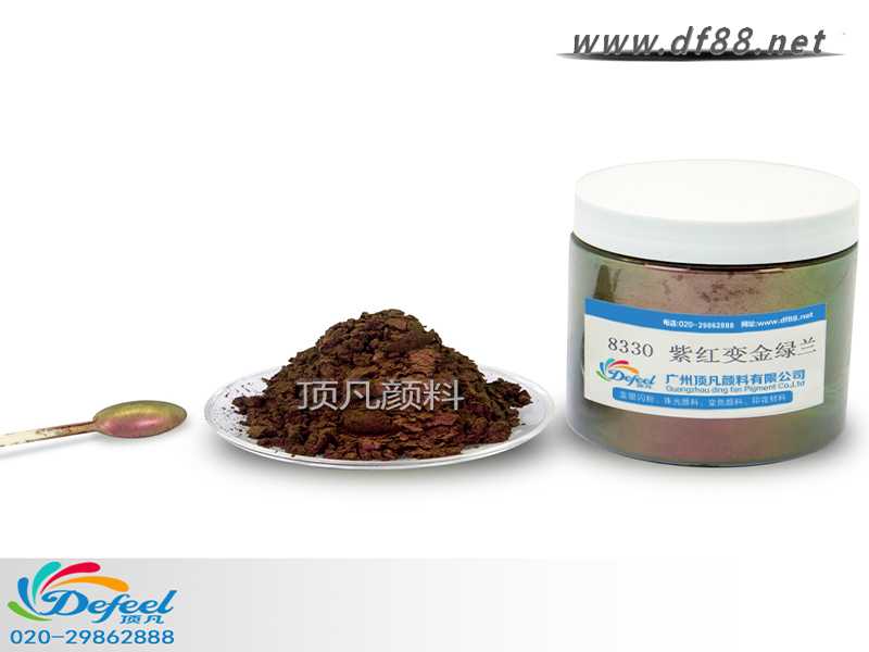 8330 紫紅變金綠藍變色龍粉可應用于涂料、油墨、塑料各產業,產品之設計大多以室內(無紫外光之環境)與室外(有紫外光之環境)有顏色變化為訴求。